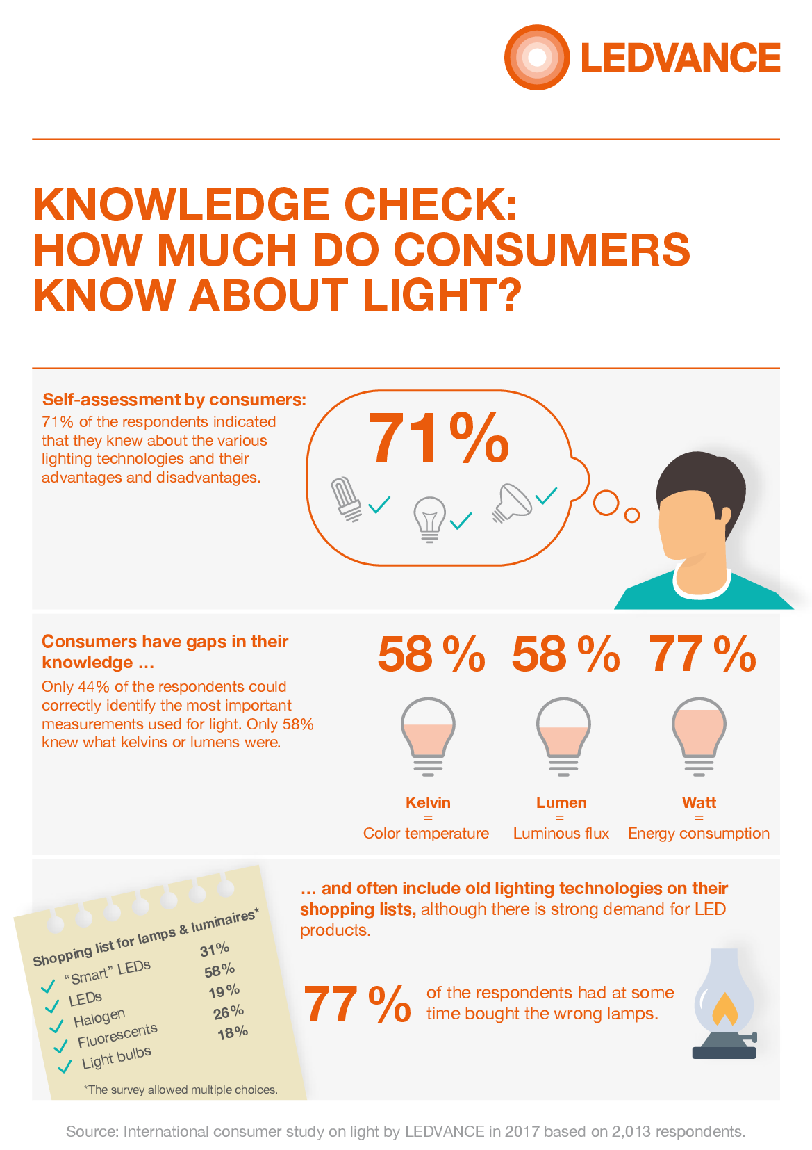 Do you know how much consumers know about lighting? Answers can be found in an international online study by LEDVANCE, which was conducted in nine countries. The representative survey commissioned by LEDVANCE and conducted by "Research Now" includes a questionnaire of 25 questions and shows that there are still major gaps in knowledge on many topics relating to current and future lighting technologies.