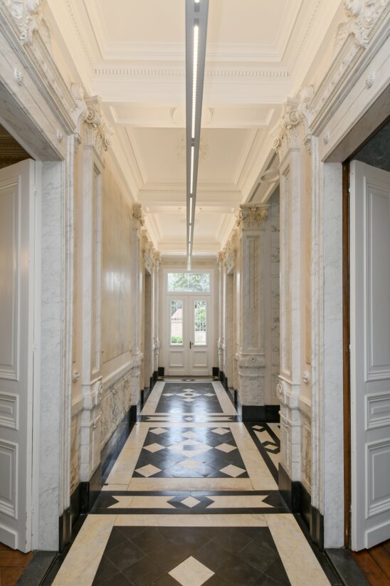 The lighting project, developed by LEDVANCE together with the owner and Architect, has played an essential role in highlighting the architectural splendor of the Wavers Huis. The interior is illuminated with Classic B 40 DIM E14 lamps for the beautiful chandeliers that adorn the various rooms. A particular highlight can be found in the entrance hall with LEDVANCE Linear Indiviled Everloop, specially mounted as a light line for this project. This provides both direct and indirect warm white light, impressively accentuating the central corridor and highlighting the monumental character of the building immediately upon entering. Residential fixtures such as Decor Tokyo Table, Planon Frameless fixtures for the ceilings, Panan Alu as desk lighting and recessed spotlights Darklight Fix were also used in the various spaces. In outdoor lighting, Endura Style Lantern Bollards were used in many places.